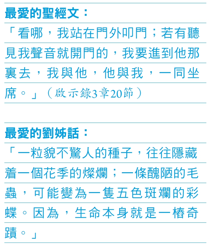 沐浴在神的話語中,許志銓敞開心胸,心也跟著喜樂,約伯記4章4節:「祢的言語曾扶助那將要跌倒的人;祢又使軟弱的膝穩固。」在俞禮正的鼓勵下,許志銓意外做了一個決定,準備讀神學院,心想,「做服事上帝的人,比工作和賺錢更重要。」