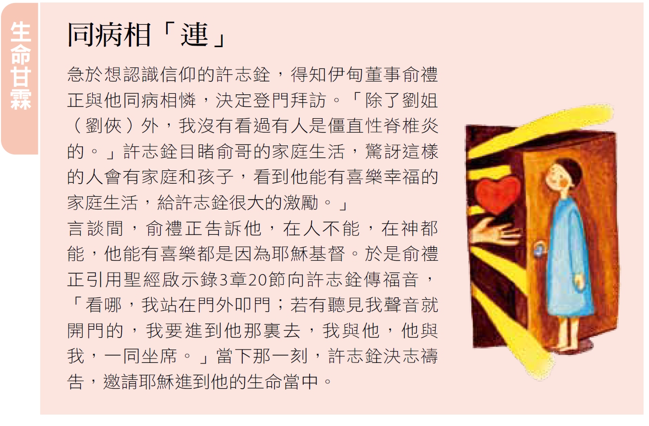許志銓讀經、傳福音,喜樂掛在臉上,他熱愛傳道人的身分,很難想像他曾經是一位自我封閉,走不出框架,對未來更是無法得著盼望的人。回溯青春時期,上天跟許志銓開了一個玩笑,他罹患僵直性脊椎炎,也就是侵犯脊椎為主的風濕病。聊起疾病的嚴重性,許志銓表示,它會造成脊椎關節以及附近的肌腱、韌帶等軟組織逐漸鈣化、僵硬,致使脊椎失去柔軟度而無法彎曲,部份患者會嚴重駝背。四個兄弟中只有他一個人發病,面對突如其來的打擊,怨懟、傷心充斥他的內心,他呼喊:「為什麼是我?!」
