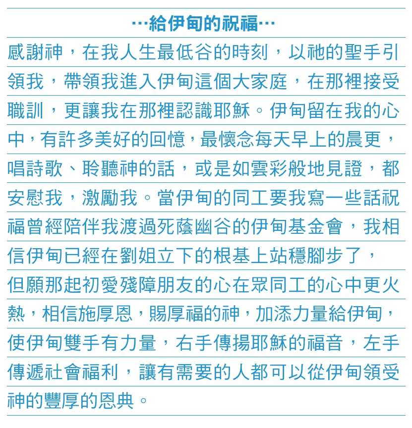 每天都在病痛中掙扎,肉體的痛苦從未消減,心靈豐盛卻是一天新似一天。來到伊甸,認識創辦人劉俠,她不僅認得每一位同工,還不時主動關心職訓學員,她的親和力令許志銓印象深刻。罹患類風濕性關節炎的劉俠和許志銓一樣病痛纏身,所不同的是,劉俠的病痛更勝一籌,大小關節都會引發疼痛。她曾經形容她的痛楚,有人從她身邊走過去的風都會引起她強烈的刺痛感,可以想見那是有多麼地痛苦難耐了。但是這樣的人,為何總是笑容滿面?許志銓好奇,「一定在她生命中有很不一樣的東西,那就是信仰。」