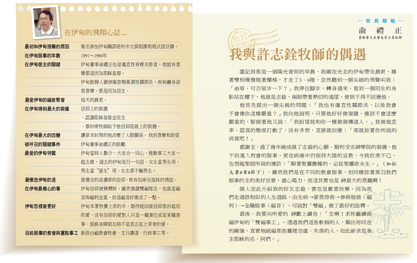 許志銓渴慕神的話語,積極到伊甸教會參與主日聚會,「進到信仰群體中,有人關心你,聚會像是一家人般充滿快樂。」在聚會中認識不同的身心障礙者。回想踏入時的心境表示,「他們和我想像中的不一樣!信仰帶給他們盼望和喜樂。」顛覆我對身障朋友既定的刻板印象。