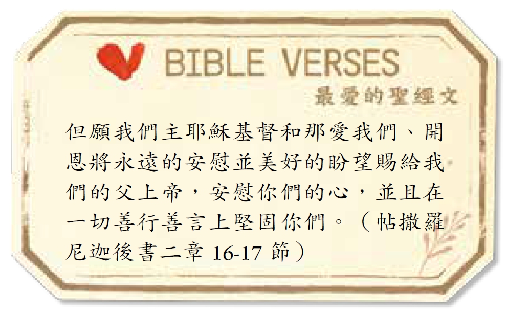 「但願我們主耶穌基督和那愛我們、開恩將永遠的安慰並美好的盼望賜給我們的父上帝,安慰你們的心,並且在一切善行善言上堅固你們。」帖撒羅尼迦後書二章16-17 節