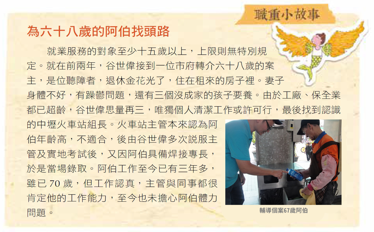張主任分享,谷世偉活出基督的生命,甚至能將教養孩子與服事案主互相結合。曾有一名智能障礙者,雖然具備工作能力,但服裝儀容與生活習慣不佳,造成轉介媒合的困難。谷世偉看見案家教養功能薄弱,便請自己年齡相近的女兒陪伴、引導個案,嘗試為她帶來改善,這份全然的付出相當難能可貴。