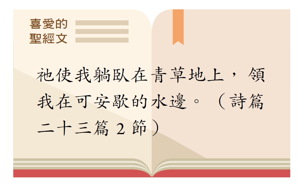 「祂使我躺臥在青草地上, 領我在可安歇的水邊。」詩篇二十三篇2 節