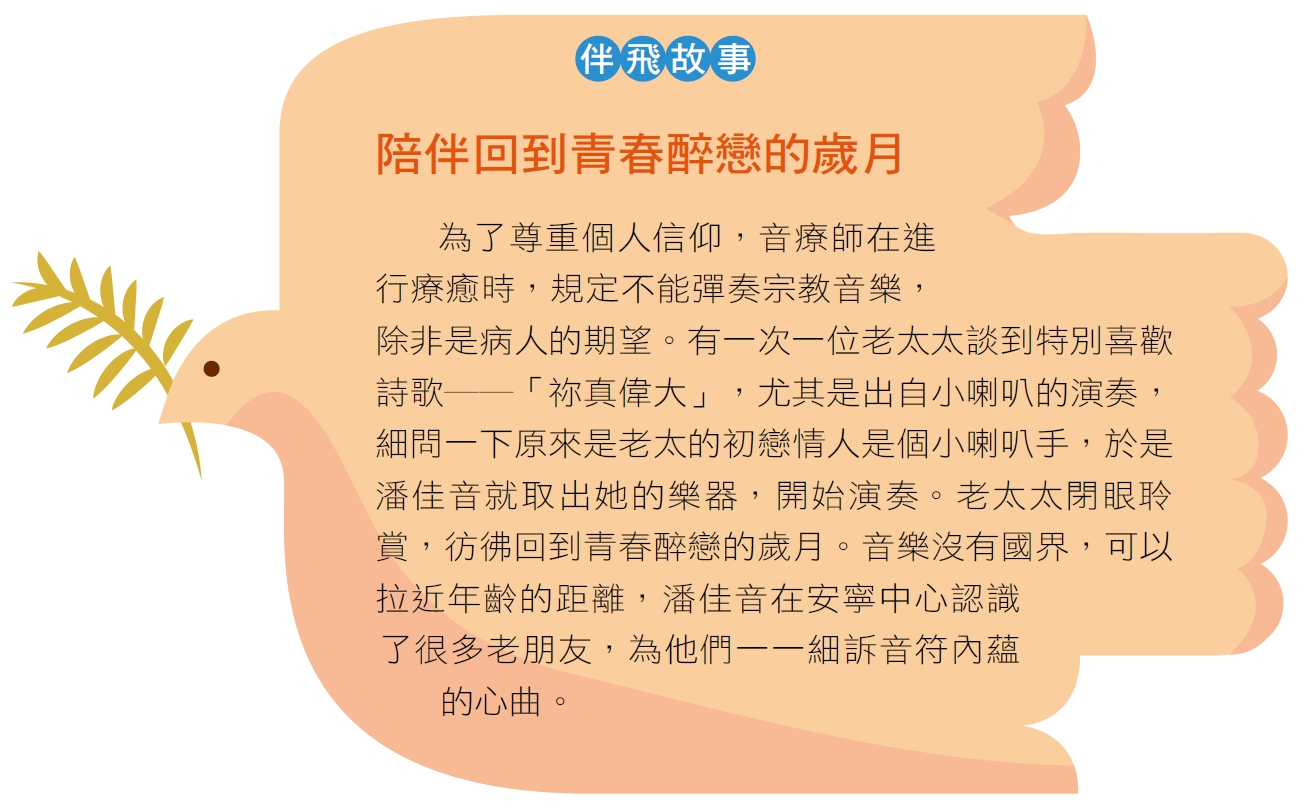 潘佳音常用的音樂治療的樂器是吉他、鐘琴,彈奏的可以是特定的曲目,更多時候是即興彈奏。特別一提的是,不只是音療師演奏,也可以請病人合奏,如將鐘琴的琴鍵擺放成宮調式,就是沒有Fa與Si 的中國音階,怎麼彈都很順耳,就變成「包容力」很強的樂器,沒有對與錯音的界限,即使彈錯,也是錯得好聽。為了尊重個人信仰,音療師在進行療癒時,規定不能彈宗教音樂,除非是病人的期望。有一次一位老太太談到特別喜歡詩歌─「祢真偉大」,尤其是小喇叭的演奏,細問一下原來是老太太的初戀情人是位小喇叭手,於是潘佳音就取出她的樂器,開始演奏,老太太輕閉眼睛聆賞,眼角閃爍著淚光,彷彿回到青春醉戀的歲月。音樂沒有國界,拉近年齡的距離,潘佳音在安寧中心認識了很多老朋友,都一一細訴音符帶來的心曲。