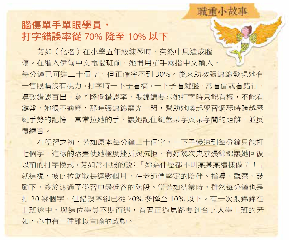 隔沒幾年,身心障礙者定額雇用法通過後,有很多輕、中度的身障朋友,多不再靠這樣的就業前職訓班而進入社會工作。伊甸將職業重建的服務目標,轉向另一群更弱勢的朋友,他們因著重度身障、無法走出家門,其中有一班,是專門開辦給腦傷朋友學習的中文電腦班,那時我也參與電腦教學工作。