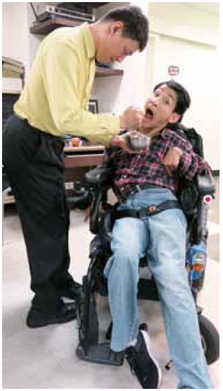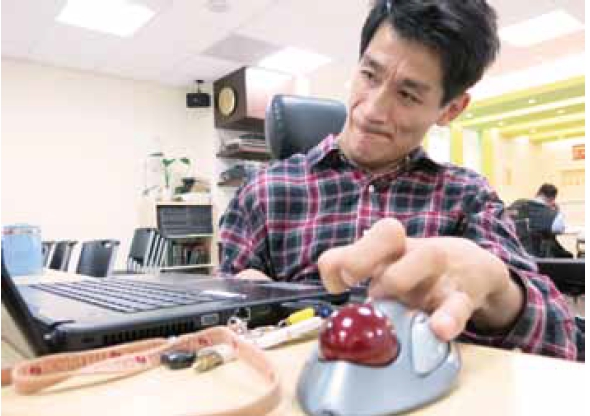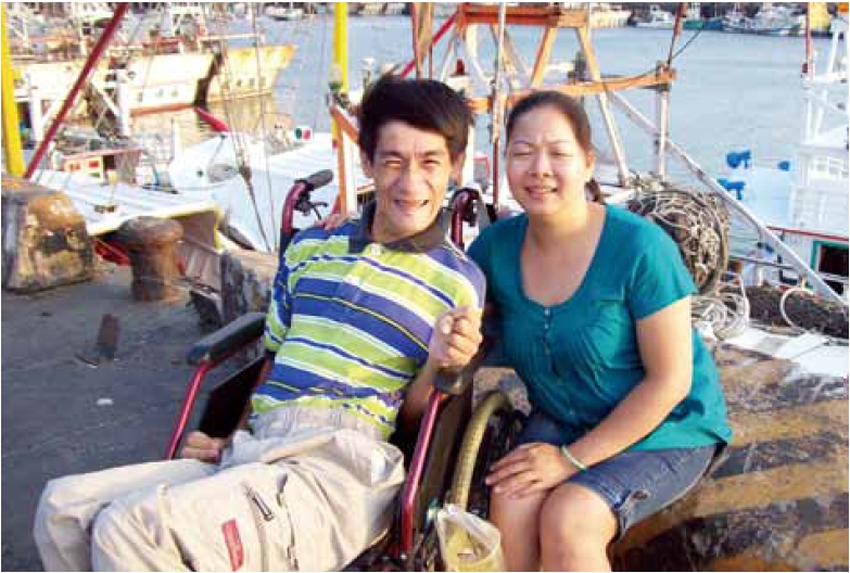 百成,是一名重度腦性麻痺的朋友,下肢不能行走,上肢嚴重緊繃,常不由自主搖動,語言表達困難,說話別人常聽不清楚,難以與之溝通。
