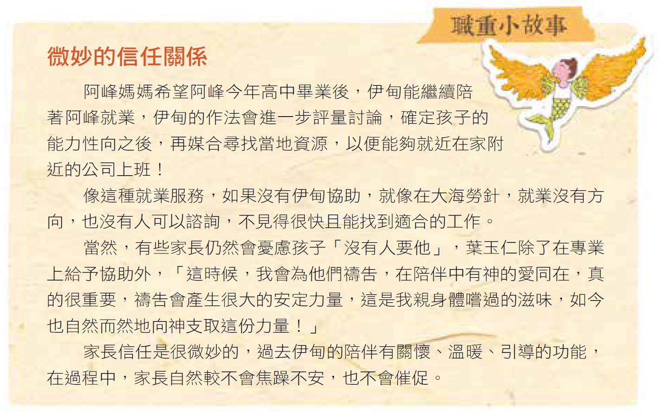 「我把這些孩子,都當成是我自己的孩子,他們長大了,不能沒有人銜接關心!」這些曾被輔導的孩子從學校畢業之後,伊甸承接他們的就業服務或者就業安置,都需要和家長一起討論,「家長看到是我在負責這項業務,就非常開心,他們知道我會盡心盡力解決他們內心的需要!」也因為家長的信任,葉玉仁很快又和家長們,接過去良好互動和默契⋯⋯。