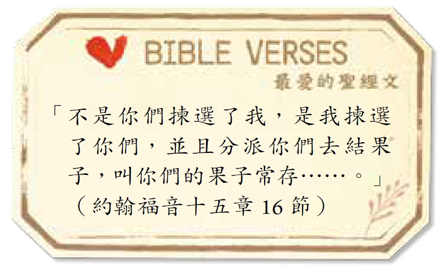 「不是你們揀選了我,是我揀選了你們,並且分派你們去結果子,叫你們的果子常存⋯⋯。」約翰福音十五章16 節