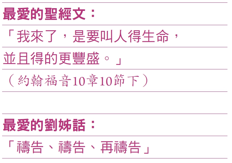 將近一個鐘頭的訪談時間,雖是初識,也足以讓人充分感受到張來好牧師身上那股容易親近、容易教人放心傾吐的特質。當話題離開服事,談及個人生命歷程,她的語氣仍然一貫輕鬆,然而口中果斷道出的,卻是如此簡單又震撼的開場白。