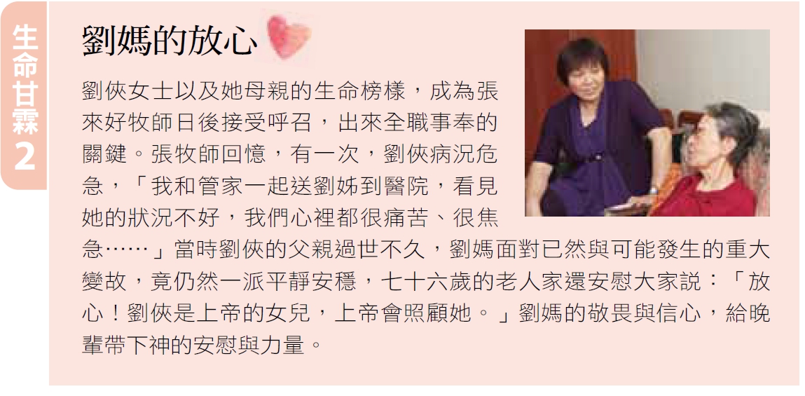 張來好加入伊甸的時候受洗不久,信仰根基不深,她一方面繼續接受母會教導,另一方面,也從伊甸的晨更與禱告會裡,得到更多養分。有好一段時間,她負責將主日講台信息文字化,以便刊登週報。這是一項非常紥根的服事,每次整理過程至少六小時,在稿件完成之前,早把信息反覆聽得倒背如流。而透過劉俠女士的分享,張來好感性地說,「我看見在主裡真善美的人生。可以聽見在工作上的主管,真實地去談自己與神的關係、自己的失敗、自己的軟弱與悔改。」神的作為透過劉俠毫不文飾的分享彰顯出來,使張來好的信心得以被堅固。