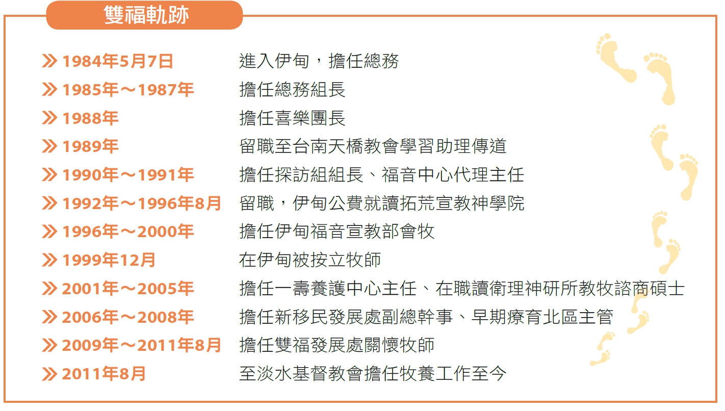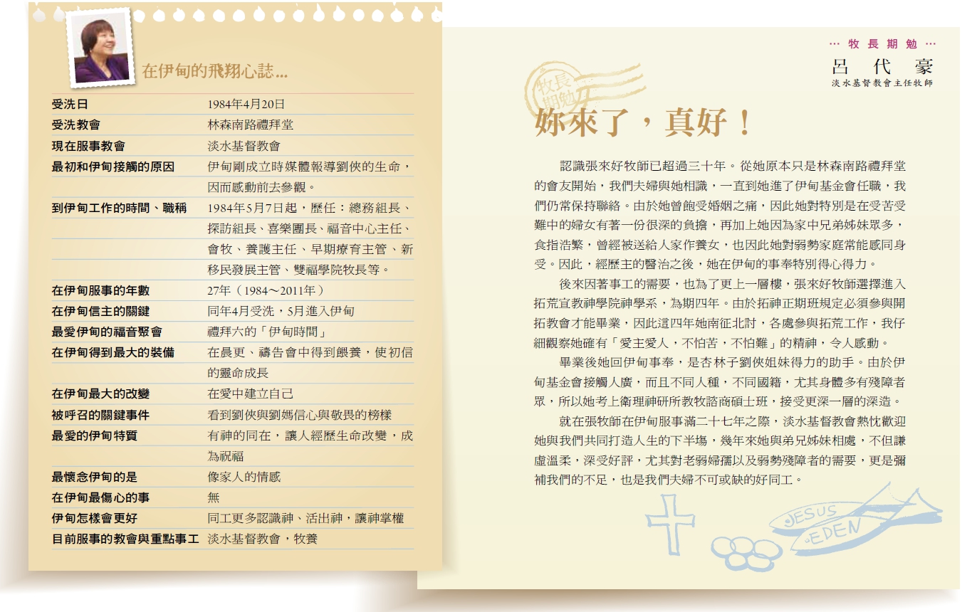 兩年半前,張來好順服神的帶領,離開伊甸,來到淡水基督教會協助牧養事工,嘗試服事不一樣的族群,直到如今。曾經歷任總務組長、探訪組長、喜樂團長、福音中心主任、會牧、養護主任、早期療育主管、新移民發展主管、雙福學院牧長,回想在伊甸二十七年的光陰,她感性地說,「我最懷念伊甸的,是像家人一樣的情感。」如同她自己深刻走過的人生體會:「如果沒有神,就沒有我」,張來好深深記念那些在主裡的家人,祝願大家:「更多認識神、活出神,更多地學習讓神工作、讓神掌權!」