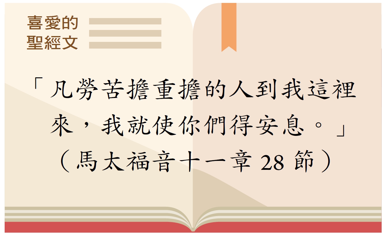 凡勞苦擔重擔的人到我這裡來,我就使你們得安息。馬太福音十一章28 節