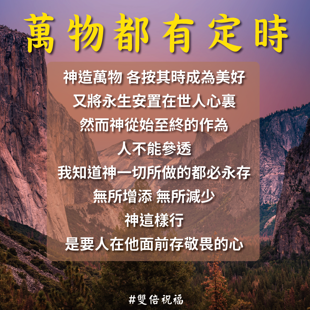 『我見神叫世人勞苦,使他們在其中受經練。神造萬物,各按其時成為美好,又將永生安置在世人心裏。然而神從始至終的作為,人不能參透。